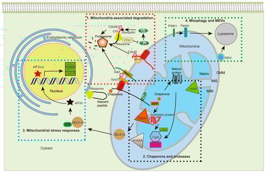 While living organisms strive to accurately convey genomic information into proteins, errors in protein synthesis and import are inevitable. MPQC, the mitochondrial protein surveillance system, seeks to mitigate these mistakes through multiple mechanisms (Figure 2). In the cytosol, cells utilize the conserved ubiquitin proteasome machineries to target misfolded proteins or those stuck to the OMM for degradation [60]. Inside the mitochondria, chaperones and proteases team up to recognize, refold, and degrade mitochondrial proteins that are disassembled or misfolded [61]. Meanwhile, mitochondrial proteotoxic stress is communicated back to the nucleus, leading to increased transcription of chaperones and proteases. Finally, when beyond repair, the cell sends part of the mitochondrial membrane as secreted vehicles or whole mitochondria to lysosomes for elimination (i.e., mitophagy) [62,63,64]. All of these MPQC surveillance mechanisms are critical for mitochondrial proteostasis and the overall health of the cell.