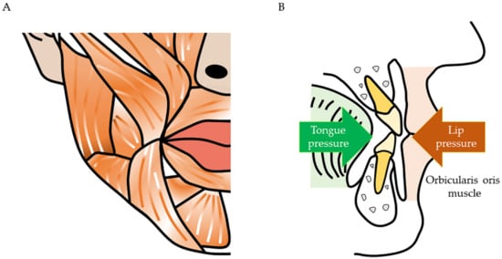 Relationship between dentition and facial muscles. (A) The muscles run vertically and horizontally on the face. (B) The teeth move to the position where the pressure is balanced. The dentition receives muscle pressure medially from the tongue muscles and laterally from the orbicularis oris and buccinator muscles. Orthodontists perform myofunctional therapy because abnormal oral habits (e.g., infant-type swallowing and tongue thrusting habit) adversely affect the dentition.