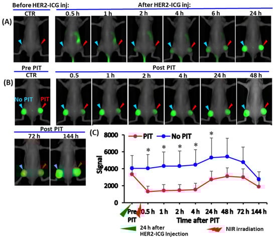 One week after inoculation, subcutaneous A4 tumors in mice reached approximately 10 mm at the longest diameter, and tumor-bearing mice received intravenous injection with HER2-ICG (100 μg) via the tail vein. To assess the biodistribution and clearance of the conjugate, the mice were anesthetized through 2.5% isoflurane inhalation and in vivo NIR fluorescence imaging was performed. Spectral fluorescence images at the dorsal position of mice were acquired using the Pearl Trilogy Imaging system (LI-COR Biosciences, Lincoln, NE, USA) with the 800 nm channel at pre-injection, followed by various post-injection time points (0.5, 1, 2, 4, 6, and 24 h). Image analysis was conducted using the Image Studio Software. After selection of the appropriate parameters and setting a suitable background reading, the region of interest was drawn to encompass the tumor and the fluorescence SI was measured.