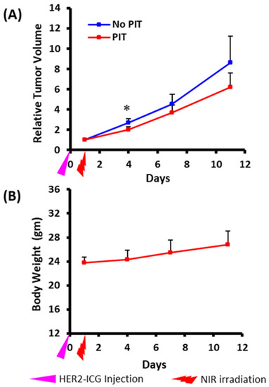 To examine the tumor response to PIT, tumors of mice (n = 5) were measured two times a week throughout the experiment using calipers, and volumes were approximated using the formula: volume (mm3) = (length (mm)) × (width (mm))2 × 0.5. Relative tumor volume was determined as the volume on the indicated day divided by the starting volume on the day prior to treatment. The body weight of mice was also weighed twice a week; general health conditions and local skin conditions at the light-exposed areas of the mice were monitored daily.