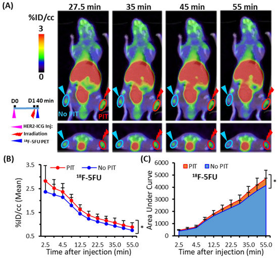 Meanwhile, due to the limited therapeutic effect of PIT alone, the combination of anticancer agents with PIT is an option to improve the therapeutic outcome. Therefore, selection of drug molecule sizes that are suitable for enhanced permeability is also important for optimizing therapeutic efficacy. Thus, a methodology that supports investigation of drug delivery of varying molecular weights coupled with PIT is desirable. Here, we radiolabeled four molecules with different molecular weights and performed imaging and quantitative analysis of their accumulation in tumors after near-infrared PIT (NIR-PIT). Our radionuclide imaging study revealed that the SUPR effect could be observed for some low and medium molecules, as well as macromolecules, in tumors after PIT and suggested that these agents are promising candidates for combined PIT. The four non-targeted radioprobes used in this study were fluorine-18-fluorouracil (