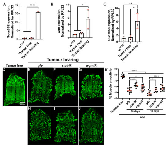 2.5. Muscle Autonomous JAK/STAT and TNF-α Signalling Drive Tumour-Induced Muscle Tissue Wasting in Drosophila
