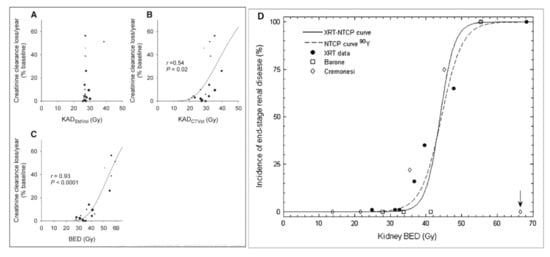 It was noted that globally, the patients receiving fewer cycles experienced higher creatinine clearance lost per year (Figure 1B). The absorbed doses were thus converted into a biological effective dose (BED) using the Lea–Catcheside formalism [], and a clear toxicity–dose correlation appeared (Figure 1C). This toxicity–dose relation observed in nuclear medicine was the first one matching that observed in EBRT (Figure 1D): the dose calculation based on fractionation commonly used in EBRT was proved applicable in nuclear medicine.