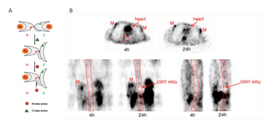 (A) Transferrin release mechanism (Reprinted from Ref. []) (B) 24 h post 86Y-DOTATOC injection from the 86Y-SMT-487 clinical trial. Metastases (M) already exhibit a strong uptake 4 h pi, while red marrow activity behaves in phase opposition to the blood pool visible in the heart. Previously irradiated vertebra by EBRT, which has eradicated active marrow, have a similar behavior as the blood pool. Reprinted with permission from Ref. []. Copyright 2021 Springer.