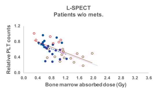 Using a SPECT/CT-planar hybrid method, Hagmarker et al. [] in 177Lu-DOTATATE therapy found similar red marrow dosimetry, i.e., 0.06 (0.02–0.12) mGy/MBq in 22 patients without skeletal metastases. They observed a dose–platelet counts nadir relationship (Figure 4) perfectly in line with that observed in the 90Y-DOTATOC clinical phase I trial using 86Y-DOTATOC PET-based red marrow dosimetry [,].