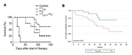This dose–response synergy was already observed in 2005 in a preclinical model []. Pancreatic cancer cells were successively grafted, i.e., spaced by 3 weeks, in the two opposite flanks of rats, resulting in rats bearing a small (≈0.5 cm2) and a large (≈8 cm2) tumor. Rats were split into four groups of about 12 individuals. Survival was impressively higher in rats treated with the 177Lu-DOTATATE and 90Y-DOTATOC tandem than that of rats treated with only one radionuclide (Figure 5A).