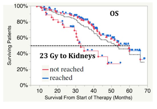 Garske-Roman et al. [] observed an impressive progression-free survival (PFS) and overall survival (OS) improvement of patients who were able to reach the 23 Gy renal dose limit (n = 114) versus those who could not, due to hematological toxicities (n = 40) (Figure 6).