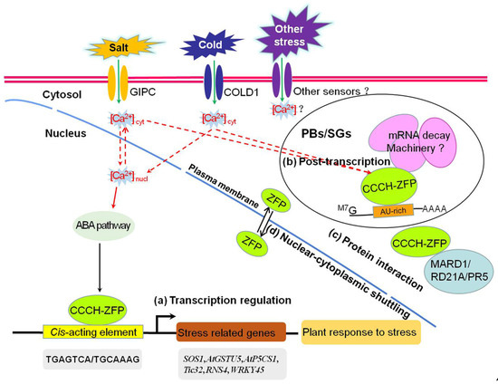 More detailed studies are needed to unravel how secondary messengers such as calcium pulses induced by abiotic stress initiate CCCH zinc-finger protein–mediated regulation of post-transcription, protein interaction, and shuttling between the cytoplasm and nucleus, although Ca2+-mediated ABA or MAPKs transcription regulation is clear.
