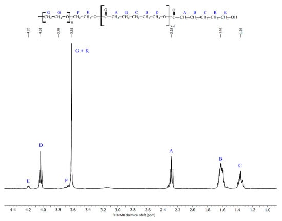 The structure of the obtained PCEC copolymers was elucidated by 1H and 13C NMR techniques. The spectra were recorded using Varian 300 MHz (Palo Alto, Santa Clara, CA, USA) and Agilent Technologies 400 MHz (Santa Clara, Santa Clara, CA, USA) spectrometer. The Mn of PCL and PEG block copolymers and their total Mn were estimated using the following equations []: