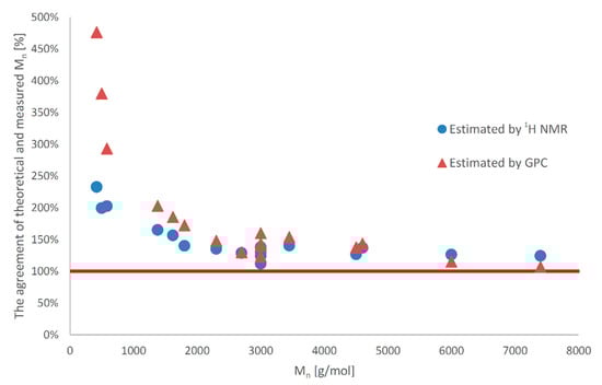 When the agreement of Mn of copolymers with the theoretical values calculated from feed ratio was compared, a decrease in percent agreement was observed with a decrease in catalyst amount from approximately 130% for 100:1 [mol/mol] to approximately 90% for 1250:1 [mol/mol]. The Mn agreement increased to the limit value (at 1000:1) as the catalyst amount was decreased; further reduction of the catalyst amount worsened the agreement, and the obtained Mn values were below theoretical assumptions (Figure 5). Furthermore, no significant relationship was perceived between the aforementioned agreement and the CL/PEG ratio. Based on these findings, the optimal CL/Zr(acac)4 molar ratio was determined to be 1000:1; the percentage agreement of Mn of copolymers between theoretical and experimental calculations appears to be the closest to 100% (Table 2 and Figure 5).
