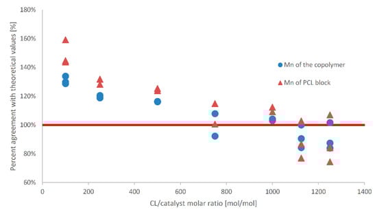 The percent agreement of Mn of the copolymers and the PCL block versus CL/catalyst molar ratio.
