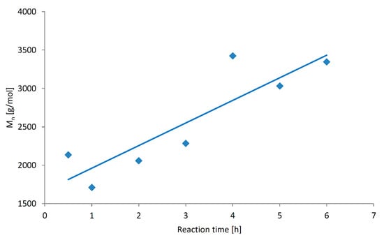 It was discovered that the conversion, products yield and Mn as well Đ increased concurrently with the reaction time; the relationship between Mn and the reaction time is presented in Figure 6. Zr(acac)4 appears to be an effective catalyst for ROP of CL in the presence of PEG as a co-initiator; the conversion value was high even though the reaction time was very short (89% of conversion after 0.5 h). The results of the reaction yield interpretation are fairly convergent, but the observed products yield values are significantly lower when compared to conversion. It is assumed that the Mn of the PCL blocks in triblock copolymer is relatively low at the initial stage of the reaction when compared to Mn of PEG; the hydrophilicity of the macromolecule is high, and thus a significant amount of the product is probably washed out at the purification stage.