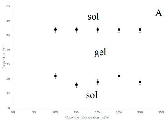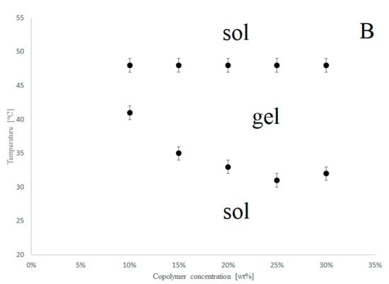 In general, it was discovered that as concentration increases, the gel window expands for Sample A; for Sample B the effect was not clearly observed (Figure 3). At higher concentrations, there are more PCEC macromolecules per volume unit, and the intermolecular interactions are stronger; micelles expand and can form a non-flowing gel at lower temperatures. Furthermore, at the same concentration, the LCST values of Hydrogel B are lower than those of Hydrogel A. This phenomenon could be explained by the fact that the Mn of the PCEC copolymer that forms Hydrogel B is slightly higher than that of Hydrogel A (3400 g/mol versus 3000 g/mol, respectively). It is well known that increasing the Mn of PCEC causes the LCST of the hydrogel to increase. The same phenomenon is seen with UCST, but it is less noticeable []. However, no significant relationships were found between copolymer concentration and UCST values. The gel–sol transition of PCEC hydrogels is thought to be caused by micelle disintegration, which leads to copolymer precipitation. Because the temperature of precipitation appears to be independent of polymer concentration, the relationship between UCST and copolymer concentration may be insignificant.