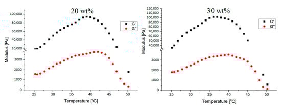 Rheological analysis was used to examine the gelation properties of PCEC-based hydrogels. The values of storage modulus (G′) and loss modulus (G″) for PCEC-A2.0 aqueous solutions at two predetermined concentrations, namely 20 wt% and 30 wt%, were determined depending on temperature. It was clearly observed for each concentration that the values of the G′ increased abruptly and reached a maximum at 39 °C and 36 °C for 20 wt% and 30 wt% solutions, respectively. The maximum G′ values for a 20 wt% solution were 94,700 Pa and 102,200 Pa for a 30 wt% solution. When the temperature goes up above 42 °C, the moduli values drop significantly due to micelle disorganisation and gel–sol transition. Figure 9 shows the relationship between G′ and G” for each concentration as a function of temperature. The results showed that the hydrogels have good mechanical properties as potential injectable DDS; it is a free-flowing sol at room temperature and forms a stable gel at physiological temperature.