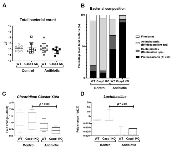 Characterization and quantification of total bacteria, the phylum Firmicutes, Actinobacteria, Bacteroidetes and Proteobacteria, and the genera Clostridium XIVa and Lactobacillus by qPCR in control and antibiotic-treated WT and Casp1 KO mice. (A) Representative cycle threshold (CT) values for total bacterial qPCR detection. (B) Percentage (%) of the composition including Firmicutes, Actinobacteria (Bifidobacterium spp), Bacteroidetes (Bacteroides spp) and Proteobacteria (E. coli), representing the commensal microbiota from the total bacterial abundance and (C) abundance of Clostridium cluster XIVa and (D) Lactobacillus Order of the Firmicutes phylum. (A) Data are presented as mean (SD), n = 7–10/group. (B) Data are presented as percentage of each phylum from the fold change of the total bacterial abundance. (C,D) Data are median (interquartile range) (SD).