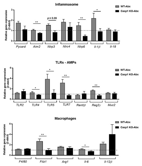In line with previous reports in C57BL/6 mice treated with the 2-week Abx-cocktail [20,21], alterations in TLR4,-5,-7 gene expression as well as inflammasome associated genes were evident in the WT-Abx group (Figure 2A,B). However, Abx treatment to the Casp1 KO group reduced the expression of most host-microbe associated genes from the inflammasome, TLR and AMP pathways, with a reduction in Aim2 (p < 0.001), Nlrp3 (p = 0.06), Nlrp6 (p < 0.001), Il-1β (p < 0.05) (Figure 2A), TLR4 (p < 0.05), TLR5 (p < 0.05), TLR7 (p < 0.001) and Reg3γ (p < 0.001) (Figure 2B) compared to the WT-Abx group. With regard to macrophage-associated gene expression signature, a significant reduction in Fitz1 (p < 0.001) and Il-6 (p < 0.05) (M2 and M1 marker, respectively) was seen in the Abx-treated Casp1 KO group compared to the WT group counterpart (Figure 2C). In addition, significant reductions in the expression of mKC (a neutrophil attracting chemokine, p < 0.01) and the T cell markers (CD3 (p < 0.001), CD4 (p < 0.01) and CD8 (p < 0.05)) was detected in Abx-treated Casp1 KO group compared to the WT-Abx treated group (Supplementary Figure S3).