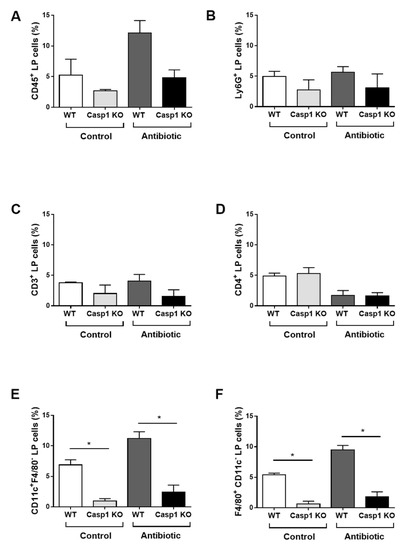 Colonic lamina propria (LP) cells isolated from control and antibiotic-treated WT and Casp1 KO mice and stained with (A) CD45 (Leukocytes); (B) Ly6G (neutrophils); (C) CD3 (CD3+ T cells); (D) CD4 (CD4+ T cells); (E) CD11c (dendritic cells); and (F) F4/80 (macrophages). Bars represent the percentage of the indicated cell population. Representative figure of two individual experiments. Data are mean (SEM). n = 4–5/group. *: p < 0.05.