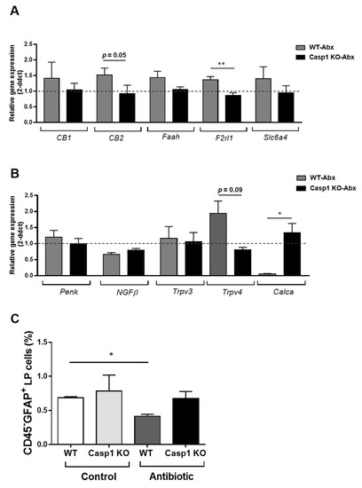 The assessment of RNA expression of selected genes representative of known nociceptive pathways in the gut, including endocannabinoid, the protease-activated receptor 2 (PAR2, Fr2l1), serotonin and vanilloid families, revealed similar expression levels in the Casp1 KO control compared to the WT control group (Supplementary Figure S4). Genes belonging to the endocannabinoid system (CB2, p = 0.05), the protease-activated receptor 2 (Fr2l1) (p < 0.001) (Figure 4A) and the vanilloid system (transient receptor potential Trpv4, p = 0.09) (Figure 4B), all of which induced by the Abx-treatment in WT mice, were reduced in expression in the Abx-treated Casp1 KO mice. Similar non-significant gene expression reductions were seen for CB1, Faah, and the serotonin transporter (Scl6a4) in Abx-treated Casp1 KO mice (Figure 4A,B). In contrast, the expression of calcitonin-related polypeptide alpha (Calca) was significantly increased (p < 0.05) in Abx-treated Casp1 KO mice compared to the WT-Abx treated group (Figure 4B). In addition, a significant reduction in the number of GFAP+ enteric glial cells was found in the Abx-treated WT-mice (p < 0.05) but not in the Abx-treated Casp1 KO group (Figure 4C).