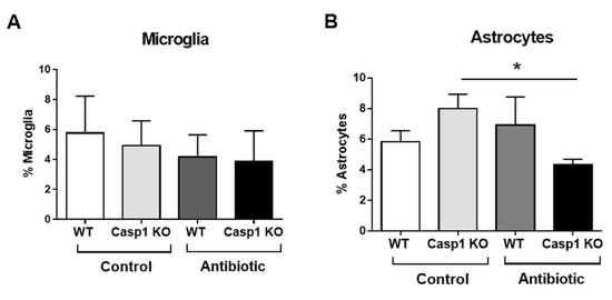 Representative percentage (%) of (A) microglia and (B) astrocytes cell average in the anterior cingulate cortex (ACC) of WT and Casp1 KO control and antibiotic-treated groups. Data are mean (SD). n = 3/group. *: p < 0.05.