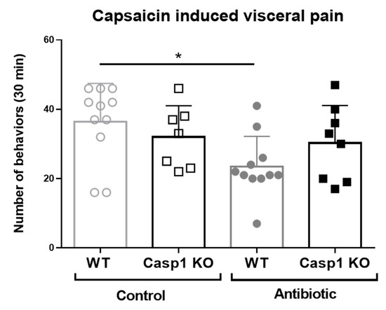 Our above findings indicated that the response to pain in Abx-treated Casp1 KO mice is altered, which is why a behavioral study using capsaicin was conducted. Capsaicin installation induced pain-related behaviors in all mice during the 30 min observation period. The predominant behaviors included the licking of the abdomen, stretching of the abdomen and squashing of the lower abdomen against the floor, all considered to reflect maximum levels of painful behavior observed [18]. Capsaicin-induced pain-related behaviors were reduced by 36% in Abx-treated WT mice (23.5 ± 2.6 behaviors/30 min, n = 11, 5 males and 6 females) compared to WT vehicle-treated mice (36.5 ± 3.3 behaviors/30 min, n = 11; p < 0.05; Figure 6). In contrast, Abx- and vehicle-treated Casp1 KO mice had a similar number of behaviors (33.0 ± 3.4 and 30.2 ± 3.8 behaviors/30 min, respectively) to that of WT-vehicle-treated mice (36.5 ± 3.3 behaviors/30 min). Collectively, the data indicate no attenuation in pain-induced behavior in Casp1 KO mice associated with antibiotic-induced microbial perturbation.