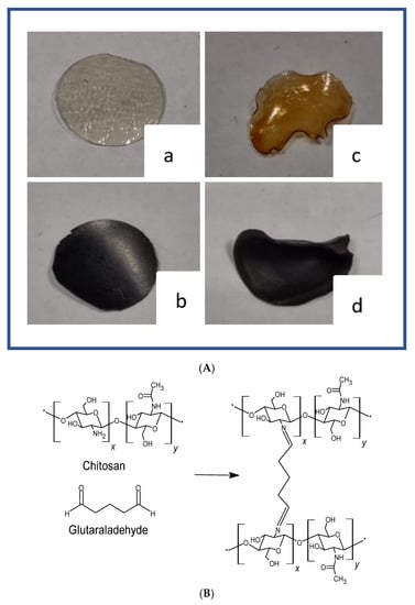 (A) Illustration of non-crosslinked CS (a) and CS_GO10 (b); and crosslinked CS (c) and CS_GO10 (d). (B) Scheme of the crosslinking reaction between chitosan and glutaraldehyde.