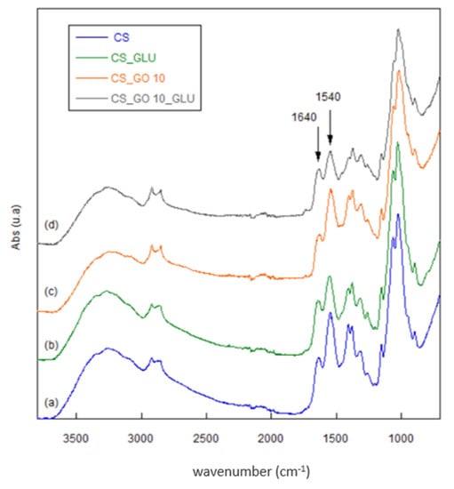 FTIR spectra of pristine CS (a), CS_GLU (b), CS_GO10 (c), and CS_GO10_GLU (d).