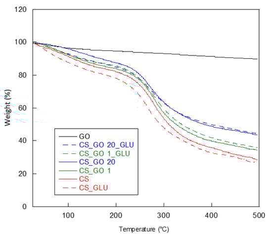 Thermogravimetric curves of pristine CS, GO, and CS_GOX composites before and after the crosslinking reaction.
