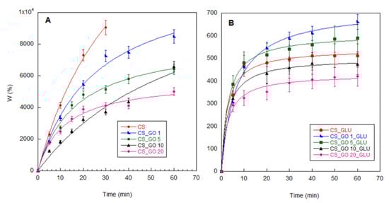 Water-uptake kinetics of non-crosslinked (A) and crosslinked (B) CS and CS_GOX composites.