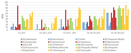 The recovery capacity, expressed in percentage (R%), was obtained for each pesticide and is reported in Figure 6. By observing the R% data, it was possible to verify that the yields depended on the hydrophobicity of the membranes. Generally, pollutants with log Kow between 0.8–2 (pesticides A–D; blue-coloured) showed low R% when CS or CS_GO with low GO content were used (1% and 5%). This could be related to the more hydrophilic nature of those composite membranes (see contact-angle measurements), which allowed a strong interaction with the pollutants, but compromised the extraction phase. Notably, the CS_GLU sample displayed R% values slightly higher than CS_GO1_GLU and CS_GO5_GLU. Most likely, the low permeability of the CS_GLU membrane (see Figure 5) allowed the pesticides’ adsorption, mainly on surface layers, making the extraction easier but still relatively low. Interestingly, when the GO content was high, as for the CS_GO10_GLU and CS_GO20_GLU composites, an enhanced recovery of those pollutants was obtained. To explain this behaviour, a synergic effect between the CS and GO was hypothesized. In fact, thanks to the simultaneous presence of hydrophilic groups (NH2 and OH groups of CS, as well as OH and COOH groups of GO) and hydrophobic zones, a suitable interaction between the composite membranes and pesticides with low log Kow was possible. Therefore, by employing the composite membranes with a high GO amount, it was possible to modulate the CS adsorption properties to favour the interactions with hydrophobic pollutants and reduce the interactions with hydrophilic pollutants. A similar behaviour was verified for pesticides with a log Kow value between 2 and 3 (pesticides E,G,H,I; red-coloured) with the exception of Hexythiazox (G), for which a high R% was obtained with all systems. Quite high R% values were registered when testing the pesticides with a log Kow between 3 and 6 (green and yellow colours) for all composites. Interestingly, the increase in the matrix hydrophobicity did not compromise the extraction of more hydrophobic pollutants, which, on the contrary, increased with the increase in GO content. In fact, the best results were achieved by using the CS_GO20_GLU sample as sorbent material. This behaviour suggested how the formation of hydrogen bonds and hydrophobic interactions (π-stacking) could be modulated by varying the GO content into the CS-based membranes, with the advantage of a better pollutant extraction.