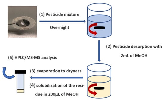 A specific device, a rotating-disk SPE developed by Tomai et al. [47], containing about 40 mg of membrane, was immersed in the pesticide solution (50 mL, 5 µg/L). The system was left under magnetic stirring overnight for 16 h at 100 rpm to favor analyte adsorption on the membrane. Afterwards, to remove the excess of water, the device was dabbed with a filter paper and the analytes were extracted with two 2 mL fractions of methanol under magnetic stirring (100 rpm). The contact time for each fraction was 30 min. The volume of each single fraction was enough to completely cover the composite membrane. The two organic fractions were collected into a 15 mL falcon tube and evaporated to dryness at 40 °C under nitrogen flow. Finally, the residue was dissolved in 200 μL of methanol, and 2 μL was injected into the HPLC-MS/MS system. The pesticide extraction procedure is reported in Figure 7.