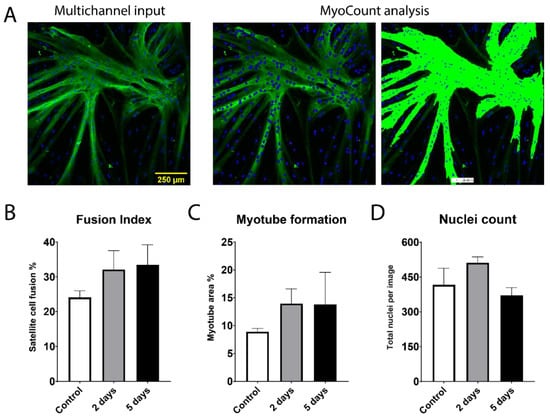 - Murphy, D.P.; Nicholson, T.; Jones, S.W.; O’Leary, M.F. MyoCount: A software tool for the automated quantification of myotube surface area and nuclear fusion index [version 1; referees: 2 approved]. Wellcome Open Res. 2019, 4, 6. [Google Scholar] [CrossRef] [Green Version]