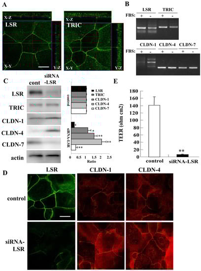 The airway epithelium of the human nasal mucosa interacts with various environmental agents and acts as a physical barrier that protects against inhaled substances and pathogens via tight junctions (TJs) [,]. Nasal epithelial barrier dysfunction contributes to various nasal diseases, including allergies [,,,,]. TJs are intercellular junctions adjacent to the apical ends of paracellular spaces and have fence, barrier and signaling functions []. TJ proteins are closely involved in cancer, innate immunity, and infectious diseases []. TJs are composed of claiudins (CLDNs), occludins (OCLN), JAMs and scaffold proteins such as ZO []. Angulin-1/lipolysis-stimulated lipoprotein receptor (LSR) and tricellulin (TRIC) seal the extracellular spaces where three epithelial cells come into contact and have various functions []. The family of angulins consists of angulin-1/LSR, angulin-2, (immunoglobulin-like domain-containing receptor 1 [ILDR1]) and angulin-3 (ILDR2) []. LSR recruits TRIC to tTJs, and both proteins are required for the full barrier function of epithelial cellular sheets []. Downregulation of LSR influences not only the barrier function but also various kinds of signaling [,,]. In the human nasal epithelium, OCLN, JAM-A, ZO-1, ZO-2, CLDN-1, -4, -7, -8, -12, -13, -14 at bicellular TJs (bTj) and TRIC and angulin-1/LSR at tricellular TJs (tTJ) are detected on the surfaces of cells [,].