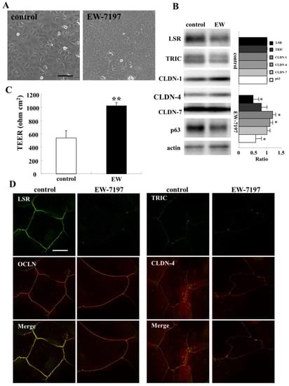 The TGF-β receptor type 1 inhibitor EW-7197 induces the epithelial barrier with an increase of anguin-1/LSR expression at the membranes in primary cultured normal human lung epithelial cells []. To investigate the regulation of angulin-1/LSR expression in human nasal epithelia, HNECs were treated with 10 μM EW-7197 for 24 h. Phase-contrast imaging revealed that cells treated with EW-7197 changed to an epitheloid-like shape (Figure 2A). Western blot analysis showed that treatment with EW-7197 decreased expression of angulin-1/LSR, TRIC, and p63 and increased expression of CLDN-1 and -4 (Figure 2B). Treatment with EW-7197 enhanced the epithelial barrier function compared to the control (Figure 2C). In immunocytochemistry, the expression of angulin-1/LSR and TRIC was concentrated at the areas of tTJs from bTJs by treatment with EW-7197, while no change of OCLN and CLDN-4 was observed at the membranes (Figure 2D).