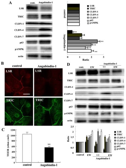 A binder to angulin-1/LSR angubindin-1 decreases the epithelial barrier function at tTJs in various types of cells [,,,]. To investigate the effects of angubindin-1 on the epithelial barrier of human nasal epithelia, HNECs were treated with 2.5 μg/mL angubindin-1 for 24 h. Western blot analysis showed that angubindin-1 decreased angulin-1/LSR expression, and increased expression of CLDN-4, -7, p63, and phospho-AMPK (pAMPK) (Figure 4A). Immunocytochemical analysis showed that treatment with angubindin-1 decreased angulin-1/LSR but not TRIC at the tTJs (Figure 4B). TEER values were decreased in HNECs treated with angubindin-1 (Figure 4C). Treatment with the TGF-β receptor type 1 inhibitor EW-7197 prevented upregulation of CLDN-4 and pAMPK (Figure 4D).