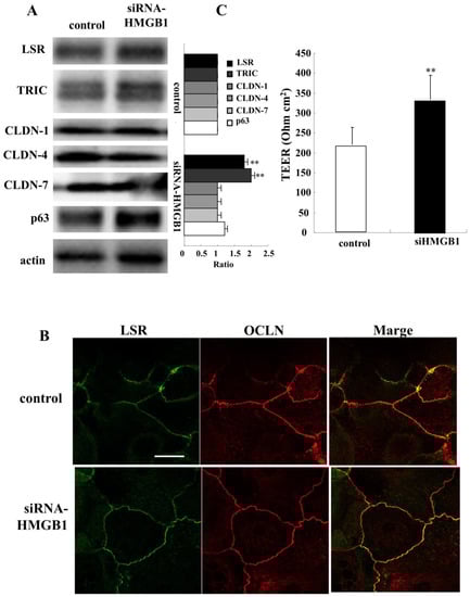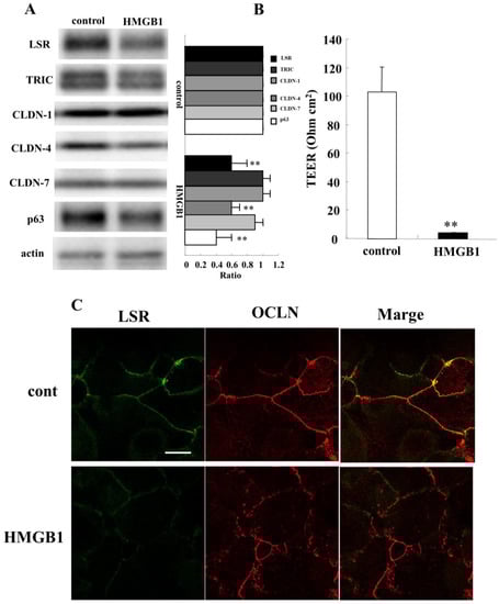 A rabbit polyclonal anti-lipolysis-stimulated lipoprotein receptor (LSR) antibody was obtained from Novus Biologicals (Littleton, CO, USA). A mouse monoclonal anti-LSR antibody was from Abnova (Taipei, Taiwan). A monoclonal anti-CD11c antibody was from DAKO (Carpinteria, CA, USA). Rabbit polyclonal anti-claudin (CLDN)-1, anti-CLDN-4, anti-CLDN-7, anti-tricellulin (TRIC) antibodies and mouse monoclonal anti-occludin (OC-3F10, OCLN), anti-CLDN-1(2H10D10), and anti-CLDN-4 (3E2C1) antibodies were from Zymed Laboratories (San Francisco, CA, USA). Rabbit polyclonal anti-p63 and anti-HMGB1 antibodies were from Abcam (Cambridge, MA, USA). A rabbit polyclonal anti-actin antibody and recombinant human HMGB1 were from Sigma-Aldrich Inc. (St. Louis, MO, USA). Rabbit polyclonal anti-phosphorylated-AMPK was from Cell Signaling Technology (Danvers, MA, USA). A rabbit polyclonal anti-actin antibody was from Sigma-Aldrich Inc. (St. Louis, MO, USA). The TGF-β receptor type 1 inhibitor EW-7197 (N-((4-([1,2,4] triazolo [1,5-a] pyridin-6-yl)-5-(6-methylpyridin-2-yl)-1H-imidazol-2-yl) methyl)-2-fluoroaniline) was from Cayman Chemical (Ann Arbor, MI, USA). Recombinant human TGF-β and oncostatin M were from PeproTech (London, UK). Alexa Fluor 488 (green)-conjugated anti-rabbit IgG, and Alexa Fluor 594 (red)-conjugated anti-mouse IgG antibodies and Axea Fluor 594 (red)-phalloidin were from Molecular Probes, Inc. (Eugene, OR, USA). FITC-dextran (FD-4, MW 4.0 kDa) was from Sigma-Aldrich Co. (St. Louis, MO, USA). The ECL Western blotting system was from GE Healthcare UK, Ltd. (Buckinghamshire, UK).