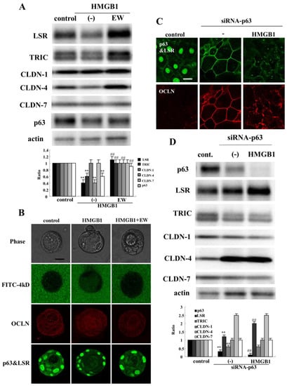 For RNA interference studies, small interfering RNA (siRNA) duplexes targeting the mRNA sequences of human LSR and p63 were purchased from Thermo Fisher Scientific (Waltham, MA, USA). The sequences were as follows: siRNA of LSR (forward sense 5′-CCCACGCAACCCAUCGUCAUCUGGA-3′, reverse sense 5′-UCCAGAUGACGAUGGGUUGCGUGGG-3′), siRNA of p63 (forward sense 5′-CCCACGCAACCCAUCGUCAUCUGGA-3′, reverse sense 5′-UCCAGAUGACGAUGGGUUGCGUGGG-3′), siRNA of HMGB1 (forward sense 5′-CCCACGCAACCCAUCGUCAUCUGGA-3′, reverse sense 5′-UCCAGAUGACGAUGGGUUGCGUGGG-3′). hTERT-HNECs cultured at 24 h after plating were transfected with 100 nM siRNAs using LipofectamineTM RNAiMAX Reagent (Invitrogen) for 48 h. A scrambled siRNA sequence (BLOCK-iT Alexa Fluor fluorescent, Invitrogen) was employed as control siRNA.