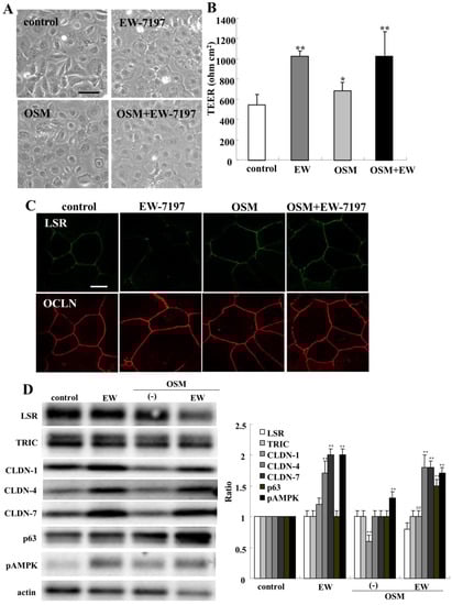 Oncostatin M (OSM) is also an inflammatory mediator associated with chronic rhinosinusitis with nasal polyps and it promotes epithelial barrier dysfunction []. To investigate the effect of OSM on the epithelial barrier and TJ molecules in human nasal epithelia, HNECs were treated with 100 ng/mL OSM with or without 10 μM EW-7197 for 24 h (Figure 8A). Treatment with OSM and/or EW-7197 increased the TEER values (Figure 8B). In immunocytochemistry of treatment with OSM with or without EW-7197, angulin-1/LSR and OCLN were observed at both the areas of tTJs and bTJs, like those of the control, whereas in treatment with EW-7197, angulin-1/LSR was strongly expressed at the tTJs (Figure 8C). Western blot analysis showed that treatment with OSM decreased CLDN-1 expression, whereas pretreatment with EW-7197 prevented the downregulation of CLDN-1 induced by OSM (Figure 8D). Treatment with EW-7197 with or without OSM increased CLDN-4, -7 and pAMPK, whereas treatment with OSM and EW-7197 decreased angulin-1/LSR (Figure 8D).