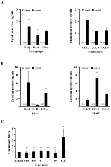 For determination of cytokine and chemokine release 2 × 106 human PBMC or 0.5 × 106, macrophages were seeded in a 24-well plate and incubated overnight with Gran1 at 37 °C. LPS (100 ng/mL) or PHA (20µg/mL, for CCL-5 release) served as positive controls. Supernatants were collected and analyzed for TNF-α, IL-1β (Endogen, Waltham, MA, USA), IL-10, CCL-2, CCL-3, and CCL-5 (all R&D systems, Minneapolis, MN, USA) by ELISA, as suggested by the manufacturer. Absorption was measured at 450 nm using Infinite 200 Pro (Tecan, Männedorf, Switzerland) plate reader. Background signals were deducted for indicated ELISA specifically mentioned in the figure legend.