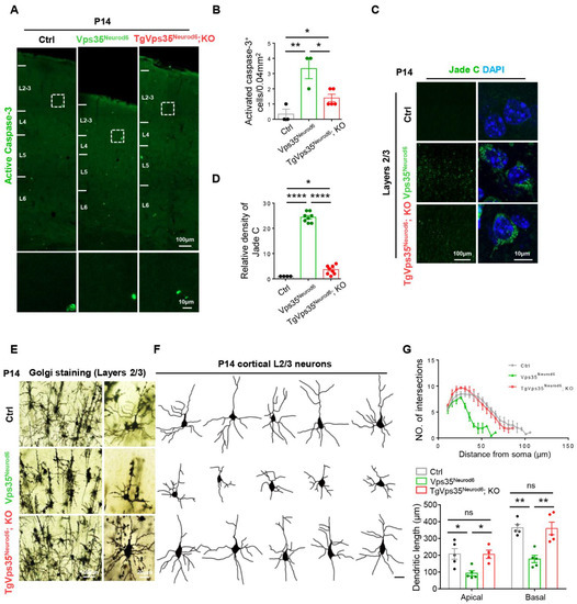 Accompanied with the reduced cortical thickness in Vps35Neurod6 mice was the increase of caspase-3+ cell death [27,32]. Therefore, we evaluated the effect of Vps35-mCherry transgene on the cell death by immunostaining analysis of the active caspase-3 positive apoptotic cells in control and mutant neocortex. As shown in Figure 2A,B, an increase in active caspase-3+ cell density was detected in P14 Vps35Neurod6 mice, in line with our previous report [27]. As expected, a significant reduction in caspase-3+ cell density was observed in TgVps35Neurod6; KO mice (Figure 2A,B), suggesting that the expression of VPS35-mCherry fusion protein could attenuate this phenotype. Furthermore, we examined neurodegeneration in TgVps35Neurod6; KO mice, and compared it with that in Vps35Neurod6 mice, by the use of Jade C staining in control, Vps35Neurod6 and TgVps35Neurod6; KO mice at P14 (Figure 2C). While Jade C positive signals were detected in both Vps35Neurod6 and TgVps35Neurod6; KO brains in L2-3 regions (Figure 2C,D), they were significantly lower in TgVps35Neurod6; KO cortex than that of Vps35Neurod6 mice (Figure 2C,D), suggesting a partial rescue of the neurodegeneration phenotype by the Vps35-mCherry transgene. Next, we evaluated the effect of VPS35-mCherry on dendritic maturation defect in Vps35Neurod6 mice, a deficit tightly coupled with the neurodegenerative phenotype [27]. Using Golgi staining analysis of P14 control, Vps35Neurod6 and TgVps35Neurod6; KO cortex to view neuronal dendritic morphologies, we observed disrupted dendritic morphologies, including reduced dendritic complexity and length, largely at layers 2–3 neurons in Vps35Neurod6 cortex (Figure 2E–G), consistent with the previous report [27]. Remarkably, this deficit was largely abolished in TgVps35Neurod6; KO mice (Figure 2E–G), suggesting a restoration of dendritic morphogenesis and maturation in Vps35Neurod6 mice by expressing VPS35-mCherry fusion protein.