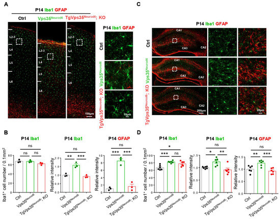 The defective dendritic morphogenesis is often associated with glial activation, which was the case in Vps35Neurod6 mice [27]. Therefore, we further examined glial cell responses in TgVps35Neurod6; KO mice, compared with that of control and Vps35Neurod6 mice. As shown in Figure 3, the P14 Vps35Neurod6 neonatal cortex exhibited increases in Iba1+ microglial cell intensity per cell, as well as elevations of GFAP+ astrocytes. However, both the intensities of Iba1+ microglia and GFAP+ astrocytes were not increased in TgVps35Neurod6; KO cortex, which were at comparable levels as those in control mice (Figure 3A,B), suggesting that a complete inhibition of glial activation in TgVps35Neurod6; KO neonatal cortex, supporting the view for the association of glial responses with neurodegeneration. Similar to the results in the cortex, an increase of the intensity of Iba1+ microglia were detected in hippocampus of Vps35Neurod6 mice, which was not observed in the age- and gender matched Vps35Neurod6 mice expressing VPS35-mCherry fusion protein at P14 (Figure 3C,D).