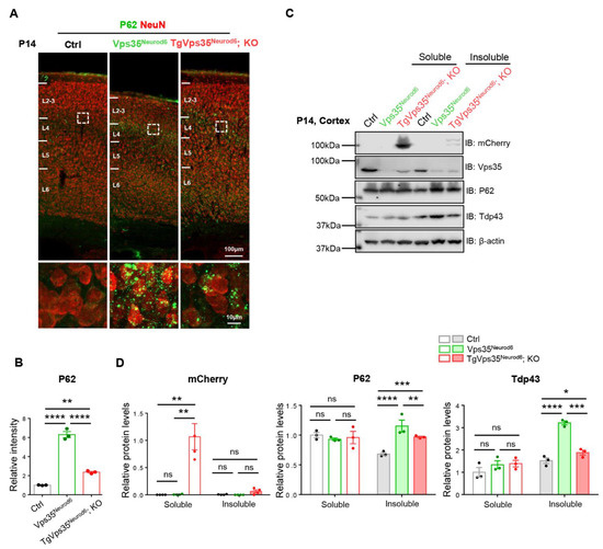 In addition to the neuronal terminal differentiation deficits and gliosis in Vps35Neurod6 mice, we also detected increases of P62/sequestosome 1 (SQSTM1), one factor that targets specific cargoes for autophagy, and Tdp-43, a DNA-RNA binding protein, in Vps35Neurod6 cortical neurons (Figure 4) [33,34,35,36], both proteins often associated with the pathology of FTD [21,37]. To determine if expressing VPS35-mCherry fusion protein could reduce this brain pathology in Vps35Neurod6 mice, we performed both coimmunostaining and Western blot analyses. Immunostaining analysis showed a partial reduction of P62 in the neocortex L2-3 of TgVps35Neurod6; KO mice as compared with that in Vps35Neurod6 mice (Figure 4A,B). Western blot analysis showed higher protein levels of P62 and Tdp43 in insoluble fractions of homogenates of both Vps35Neurod6 and TgVps35Neurod6; KO cortex than those in control mice. However, both P62 and Tdp43 proteins were lower in TgVps35Neurod6; KO than those in Vps35Neurod6 mice (Figure 4C,D). These results suggested that the aggregates of FTD-associated proteins in TgVps35Neurod6; KO mice were partially reduced.