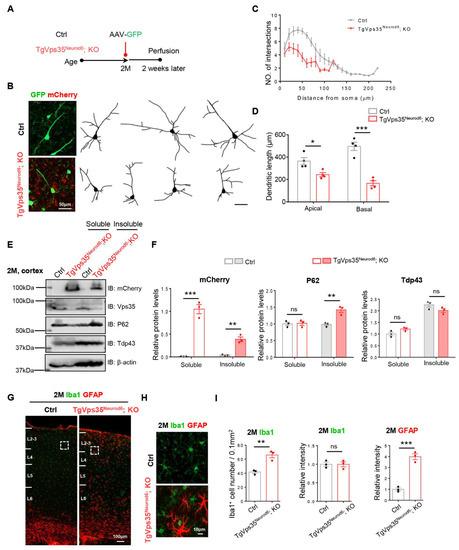 Next, we examined phenotypes in different aged TgVps35Neurod6; KO mice. First, we examined the neuronal morphology in the survived TgVps35Neurod6; KO mice at age of 2-months-old (MO), compared with the age- and gender- matched control mice (Vps35f/f) (Figure 5A,B). We examined the neuronal morphology by stereotactic injection of AAV-Syn-EGFP to fluorescently label neurons of cortex in control and TgVps35Neurod6; KO mice (Figure 5A–D). The quantification analysis showed marked reductions in dendritic intersections and length in the mutant mice (Figure 5C,D), implicating the neurodegenerative phenotype. Then, we examined other neurodegeneration associated features, including increases in P62 and gliosis. Indeed, the P62 proteins were increased in insoluble fractions of homogenates of TgVps35Neurod6; KO neocortex (Figure 5E,F); and the GFAP+ astrocytes and Iba1+ microglia were also elevated in TgVps35Neurod6; KO neocortex (Figure 5G–I). Note that the level of Tdp43 was comparable with that of control mice (Figure 5E,F). Together, these results support the view for the existence of neurodegenerative pathology in adult TgVps35Neurod6; KO mice.