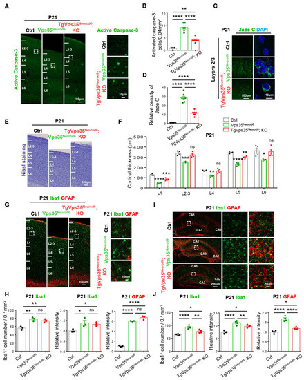 Cell death and glial activation in TgVps35Neurod6; KO mice at P21. (A) Representative images of active caspase-3 immunostaining analysis of neocortex at P21. (B) Quantification analysis of active caspase-3+ cells (n = 4–6 views from three animals per genotype; one-way ANOVA with Tukey’s multiple-comparison test). (C) Representative images of Jade C staining at P21. (D) Quantification analysis of Jade C+ cells (n = 4–7 views from three animals per genotype; one-way ANOVA with Tukey’s multiple-comparison test). (E) Representative Nissl staining of control, Vps35Neurod6 and TgVps35Neurod6; KO mice at P21. (F) Quantification analysis of Nissl staining that revealed a reduced cortical thickness of TgVps35Neurod6; KO mice compared with those of control mice (n = 4 animals per genotype; one-way ANOVA with Tukey’s multiple-comparison test). (G,I) Representative images of immunostaining analysis using indicated antibodies in P21 neocortical and hippocampal sections from mice with labelled genotype. Higher-magnification images of the boxed regions were shown in offside panels. (H,J) Quantification of immunofluorescence from G,I. (For G,H, n = 3 animals per genotype; for I, J, n = 4 animals per genotype; one-way ANOVA with Tukey’s multiple-comparison test). Scale bars as indicated in each panel. Individual data points were shown as dots with group mean ± S.E.M; * p < 0.05; ** p < 0.01; *** p < 0.001; **** p < 0.0001; n.s.: Not significant.