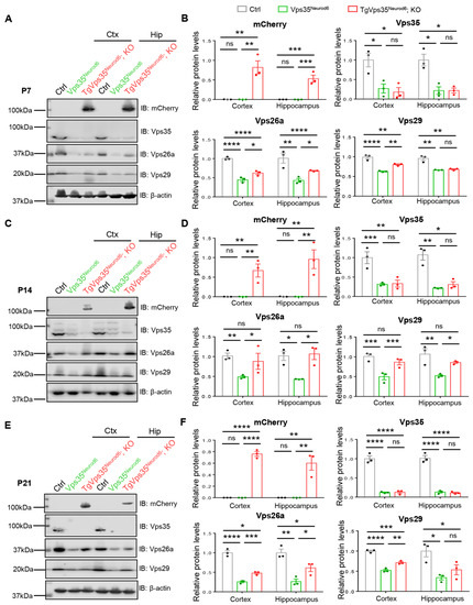 Vps35, a key component of retromer, interacts with Vps26a and Vps29 and is critical for the protein complex stability [4,38]. Therefore, we examined Vps26a and Vps29 levels in control, Vps35Neurod6, and TgVps35Neurod6; KO mice at various ages (P7, P14, and P21). As shown in Figure 7, Western blot analysis detected abundant Vps35, Vps26a, and Vps29 protein levels in control cortex, and they were largely reduced or undetectable in Vps35Neurod6 mice, in line with the view for the Vps35 function in stabilizing the complex. Interestingly, expressing the VPS35-mCherry fusion protein was capable of restoring Vps26a and Vps29 in P14 TgVps35Neurod6; KO brain (both cortex and hippocampus), at comparable levels with those of control mice (Figure 7C,D), suggesting a full rescue. However, at ages of P7 and P21, the levels of Vps26a and Vps29 were higher in TgVps35Neurod6; KO brain than those of Vps35Neurod6 mice, but remained lower as compared with those of control mice (Figure 7A,B,E,F), indicating a partial rescue. Notice that the VPS35-mCherry protein was detectable by antibody against mCherry, which showed a molecule weight of 110 kDa, but not by anti-Vps35 antibody (Figure 7), suggesting the lower sensitivity of the Vps35 antibody and/or the low level of VPS35-mCherry fusion protein expression. Together, these results suggest an age dependent restoration of the retromer complex protein in Vps35Neurod6 mice expressing VPS35-mCherry fusion protein, correlating with its age-dependent rescue effects on the neurodegenerative pathology.