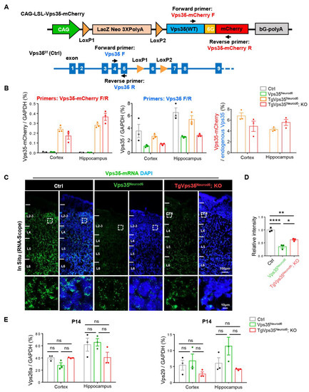 Low level of Vps35-mCherry’s expression. (A) Schematic graph illustrating the primers design for real-time RT-PCR (qRT-PCR) analysis. (B) Quantification of Vps35-mCherry and Vps35 mRNA expression in control, Vps35Neurod6, TgVps35Neurod6 and TgVps35Neurod6; KO brains (n = 3 animals per genotype). (C) Representative images of RNA scope analysis of Vps35 mRNAs (green) in control, Vps35Neurod6 and TgVps35Neurod6; KO cortex. The nuclei were stained with DAPI (blue). (D) Quantification analysis of data in (C) (n = 3 animals per genotype; one-way ANOVA with Tukey’s multiple-comparison test). (E) Quantification of Vps26a and Vps29’s mRNA levels (n = 3 animals per genotype; one-way ANOVA with Tukey’s multiple-comparison test). Scale bars as indicated in each panel. Individual data points were shown as dots with group mean ± S.E.M; * p < 0.05; ** p < 0.01; **** p < 0.0001; n.s.: Not significant.
