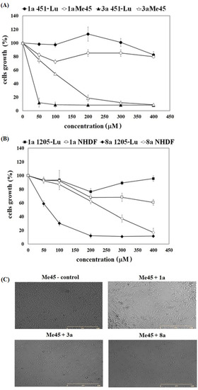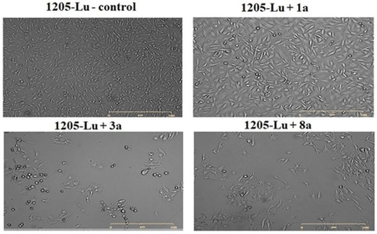 Figure 1C also presents the representative images of melanoma cells (Me45 and 1205-Lu) cultured in the presence of 100 µM of non-active compound 1a and the most active 3a and 8a. The images conform to the results of MTT assay. The influence of free acid on the cells was negligible, while ANISA incorporated into PC structure altered both the confluence and cellular morphology. The presence of rounded and shrunken cells in 3a- and 8a-treated samples suggests that the cells might undergo apoptosis.
