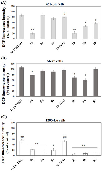 Since phenolic acids are known for their antioxidant properties, the influence of free ANISA, VA and their conjugates with PC on intracellular reactive oxygen species formation was investigated in metastatic melanoma cells. The analysis of 2′,7′-dichlorofluorescein (DCF) fluorescence showed that free acids exhibited antioxidant activity in 451-Lu (Figure 2A) and 1205-Lu (Figure 2C) cells, whereas the effects observed in Me45 were negligible (Figure 2B). In normal fibroblasts, antioxidant activity of the studied conjugates was low or negligible (Figure S2). The results obtained for ANISA (1a) and VA (1b) were compared to the results obtained for their conjugates with PC. The experiments revealed that the antioxidant potency increased for phenolic acids incorporated into PC structure. In the case of ANISA conjugates, derivative 3a was identified as the strongest antioxidant in all studied cell lines, compared to pure acid (Figure 2A–C). Other conjugates enhanced antioxidant properties of ANISA only in 1205-Lu cells (Figure 2C). Free VA also slightly reduced ROS formation. Moreover, the conjugation of VA with PC strongly increased its antioxidant effects. Similarly to ANISA derivatives, the conjugates containing VA at both positions sn-1 and sn-2 of PC exhibited the highest potency to reduce the formation of ROS, compared to free VA (Figure 2A–C).