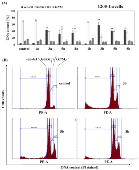 The distribution of 1205-Lu cells in major phases of the cycle. Cells were cultured for 72 h in the presence of the studied chemicals at a concentration of 100 µM. The statistical significance was determined (* p < 0.05 and ** p < 0.001) (A). Representative histograms for effects obtained in 1205-Lu cell line are shown (B).