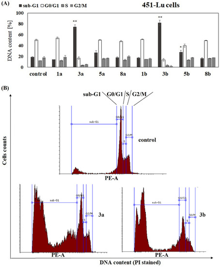 The distribution of 451-Lu cells in major phases of the cycle. Cells were cultured for 72 h in the presence of the studied chemicals at a concentration of 100 µM. The statistical significance was determined (* p < 0.05 and ** p < 0.001) (A). Representative histograms for effects obtained in 451-Lu cell line are shown (B).
