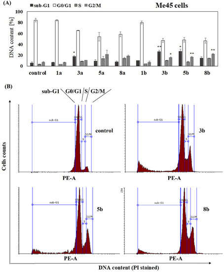 The distribution of Me45 cells in major phases. Cells were cultured for 72 h in the presence of the studied chemicals at a concentration of 100 µM. The statistical significance was determined (* p < 0.05 and ** p < 0.001) (A). Representative histograms for effects obtained in Me45 cell line are shown (B).